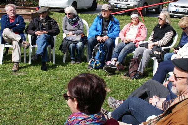Unser Gast bei dieser Auftaktveranstaltung war Karl-Heinz Krems, selbst langjähriger Naturfreund, Staatssekretär im Justizministerium, stellvertretender SPD-Vorsitzender in Düsseldorf und einer der Sprecher der Bürgerinitiative gegen die Stadtautobahn L 404n. Allerdings mussten wir gleich zum Auftakt improvisieren und die beiden Teile "politische Diskussion" und "Wandern" nacheinander statt zusammen durchführen. Drei Themen hatte Karl-Heinz für die Diskussion mitgebracht: Flüchtlingspolitik, die umweltpolitischen Vorhaben der Landesregierung und die Stadtautobahn L 404n. Gleich das erste Thema erwies sich allerdings als so interessant für die in der Sonne versammelte Teilnehmerrunde, dass wir gar nicht mehr zu den anderen beiden Themengebieten kamen. Denn wiewohl das Thema Flüchtlinge derzeit in allen Medien ist, so gab es doch immensen Informationsbedarf der Anwesenden hierzu: über die rechtlichen Rahmenbedingungen, die offiziellen Hilfsangebote, aber auch darüber, wie jeder einzelne - oder auch wir als Verein - Hilfe bieten kann.