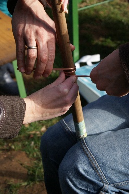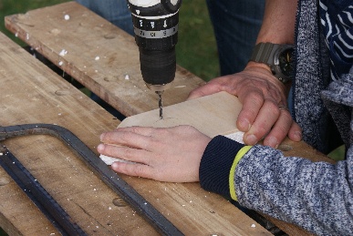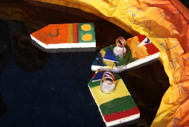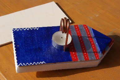 Ella hat die Bastelanleitung aufgetan, das Material besorgt und auch schon mal ein Boot gebastelt und getestet. So konnten alle Kinder und ihre Eltern schon mal sehen, wie das fertige Boot nachher aussehen muss: eine Bootsform wird aus Sperrholz ausgesägt, nach dieser Schablone wird Styropor zurecht geschnitten und mit dem Holz zusammen geklebt. Links und rechts von dem Platz, wo das Teelicht hinkommt, galt es dann je ein Loch zu bohren. Dort kommt das gewickelte Kupferrohr durch, und während die Eltern das Kupferrohr bogen haben die Kinder ihre Boote mit Farbe und Holzresten schön gestaltet. Nun wurde noch das Rohr durch das Boot gesteckt und die Enden nach hinten gebogen sowie das Teelicht draufgestellt.