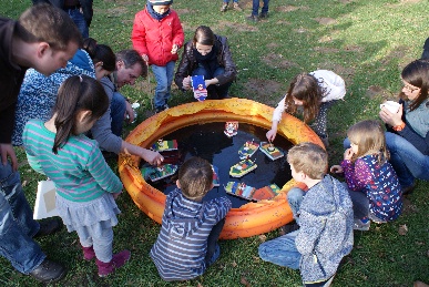 Um das Boot dann fahren zu lassen, hat Ella mit einer Spritze Wasser in das Rohr gefüllt, das Boot in ein Planschbecken gegeben und die Kerze angezündet. Durch die Wärme dehnt sich dann das Wasser aus, entweicht nach hinten durch die Rohrenden und treibt so das Boot nach vorne. Zumindest in der Theorie - der doch noch kühle Wind ließ das mit dem Antrieb leider nur bei einzelnen Booten klappen. Aber ohne Wind daheim in der Badewanne funktioniert es dann ganz bestimmt...