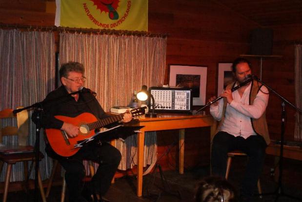 Knapp 40 Zuschauer*innen kamen an diesem Sonntagnachmittag ins Naturfreundehaus, und sie haben es definitiv nicht bereut. Erlebten sie doch die Premiere des neuen Programms von Klaus Grabenhorst (Gesang, Gitarre, Texte) und Jens Barabasch (Flöten). Unter dem Titel "Heute hier, morgen dort" präsentierten sie bekannte und unbekanntere Lieder von Hannes Wader, ergänzt um Hintergründe und Anekdoten aus seinem Leben, entnommen Waders Biografie "Trotz alledem".