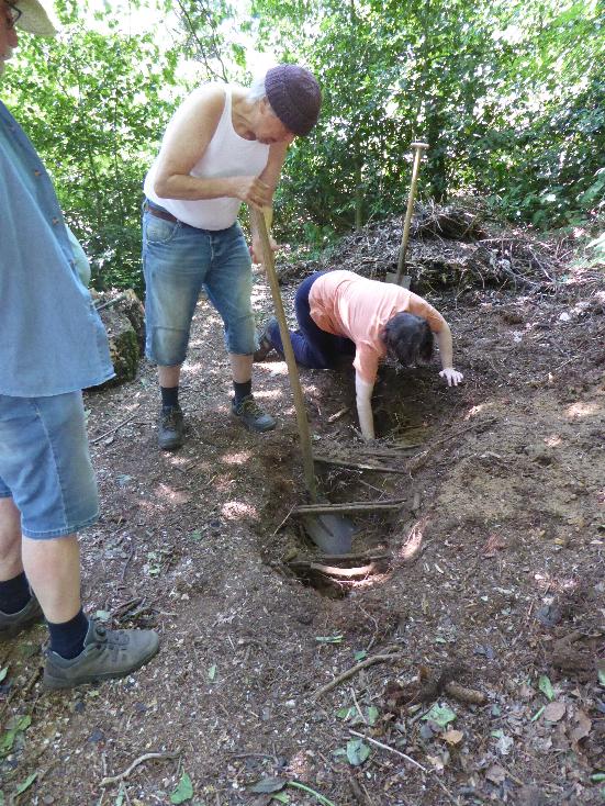 Zunächst ging es an das Ausheben des Käferkellers. Etwa ein Meter lang und 50 Zentimeter breit sollte er werden, vor allem aber auch 50 Zentimeter tief, damit die Käfer und ihre Larven, die sich dort ansiedeln, vor Frost geschützt sind. Was wir nicht so ganz bedacht haben: wenn man im Wald ein Loch buddelt, stößt man zwangsläufig auf jede Menge Wurzeln. Und so mussten wir leider immer wieder ein paar kleinere Wurzeln kappen und um die größeren Wurzeln herumgraben. Aber schließlich war es geschafft und wir konnten das Loch mit Baumstämmen und kleinerem Holz für die Zwischenräume füllen.