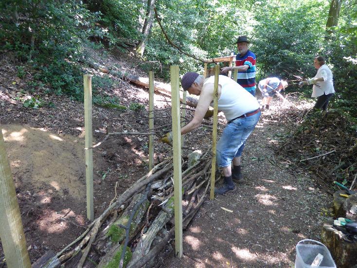 Totholz ist ein wichtiger Lebensraum für viele Tierarten - das haben wir beim Vortrag von Farina Graßmann am 17.03. gelernt. Und so haben wir beschlossen, auch an unserem Naturfreundehaus weiteren Totholzlebensraum zu schaffen. Genau drei Monate später war es dann soweit: auf der Terrasse oberhalb des Hauses haben wir als eine Totholzhecke mit Käferkeller angelegt. Nach dem Amphibienteich im letzten Jahr war dies eine weitere praktische Umsetzung im Rahmen des von der Stiftung Umwelt und Entwicklung NRW geförderen Projekts "LebensRäume - Ökosysteme verstehen und schützen" der NaturFreunde NRW.