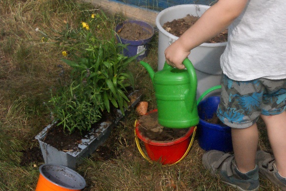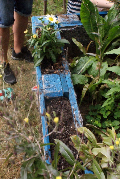 Auf insgesamt sechs Familien ist unsere Gruppe schon angewachsen, als wir am 15.08. die Hochbeete am Naturfreundehaus mit weiteren Blumenkästen bereichern. Nach einer kurzen Begrüßungsrunde sind wir erst mal in den Wald, Erde und Steine sammeln. Damit haben wir dann unsere Blumenkästen gefüllt und bepflanzt - fertige Blumenkästen, die nur noch eingehängt werden müssen und selbstgebastelte, für die wir einfach Bretter an die Füße der Europaletten angeschraubt haben. Dabei können auch die Kleinen gut mithelfen - beim Einfüllen der Erde, beim Bepflanzen, Aussäen und Gießen der Blumen sind sie mit Eifer dabei. Und als Erinnerung hat jedes Kind auch noch ein kleines Töpfchen mit gesäten Blumen mit nach Hause genommen.