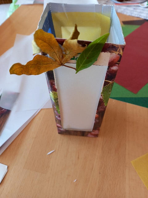 Aus einem Tetrapack und Transparentpapier/Architektenpapier wurde eine Laterne gebastelt. Blätter wurden gesammelt und getrocknet und entweder aufgeklebt oder mit Wachsmalstiften abgemalt. Auch andere Laternen wurden in den letzten Tagen von den Kindern kreativ aus einem Tetrapack oder einer Flasche gestaltet.