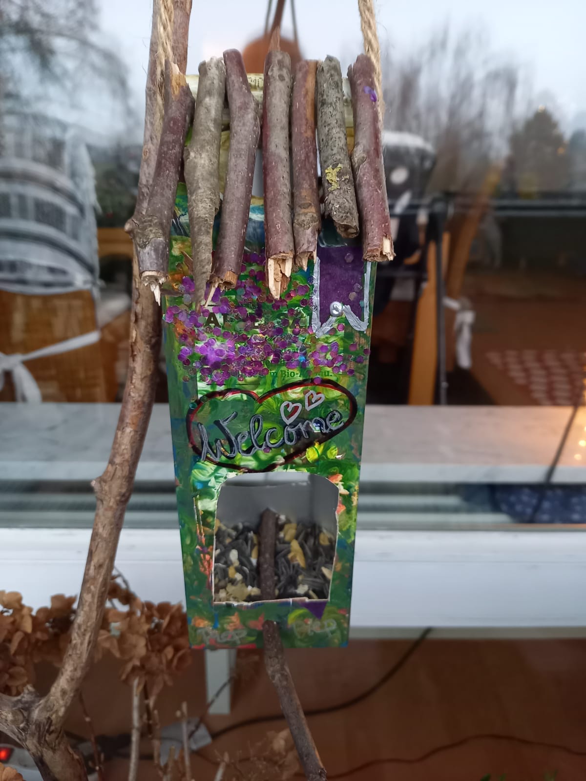Etwa 3-4 Zentimeter über dem Boden schneidet ihr ein Fenster in den Tetrapak, darunter bohrt ihr ein Loch, durch das ihr einen Stock als Sitzstange steckt. Mit weiteren Stöcken und mit Farbe könnt ihr das Häuschen schön schmücken, das Bild zeigt euch, wie es aussehen könnte. Dann noch oben durch den Tetrapak eine Kordel fädeln und mit Vogelfutter befüllen.