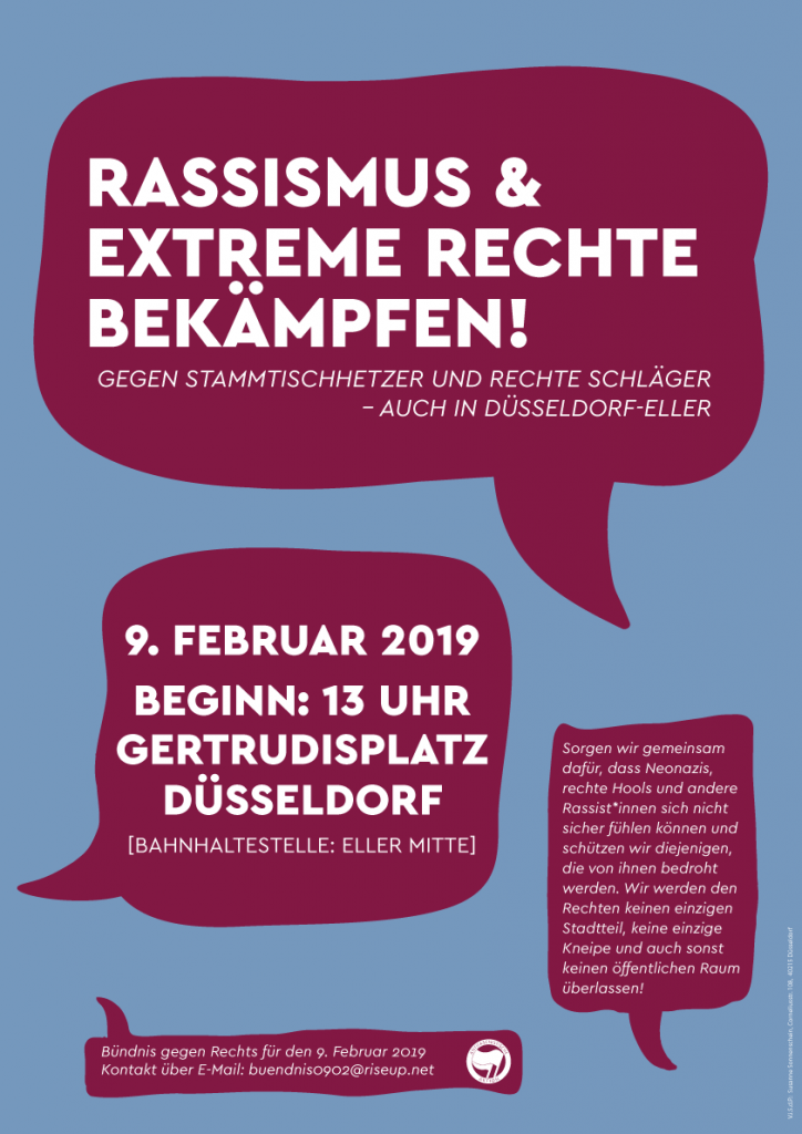 Sorgen wir gemeinsam dafür, dass sich Neonazis, Hools und Rassist_innen zurückziehen, und schützen wir diejenigen, die von ihnen bedroht werden. Dafür wollen wir für Eller, aber auch insgesamt am 9. Februar 2019 ein deutliches Zeichen setzen und mit vielen Menschen auf die Straße gehen. Wir werden den Rechten keinen einzigen Stadtteil, keine einzige Kneipe und auch sonst keinen öffentlichen Raum überlassen!