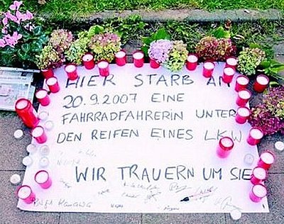 An die Tote erinnert jetzt ein Plakat: "Hier starb eine Radfahrerin unter den Reifen eines Lkw. Wir trauern um sie." Die 15 "Warnfahrer" haben unterschrieben.