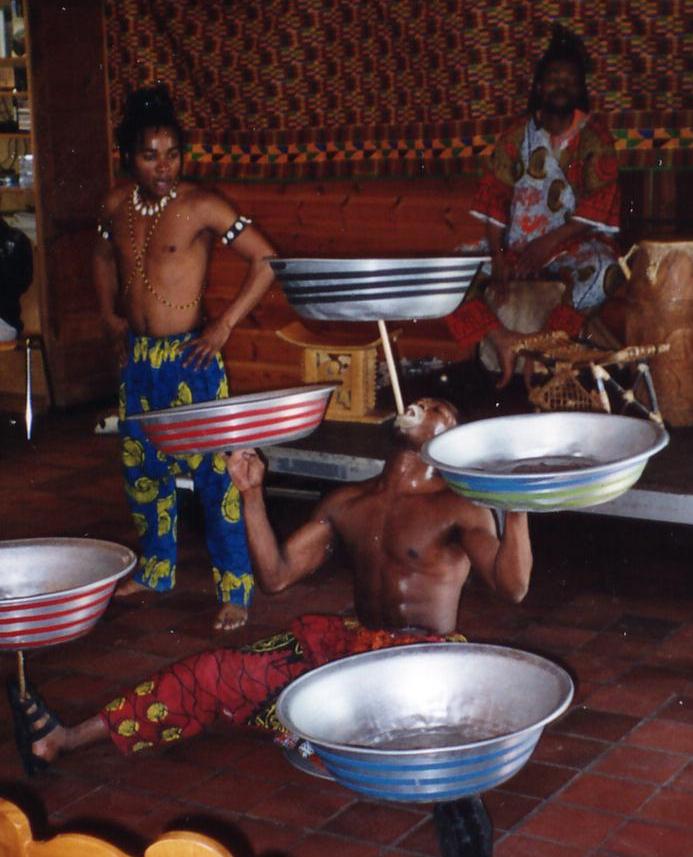 Der Höhepunkt der Veranstaltung aber war zweifellos der Auftritt der Gruppe Adesa. Akrobatik, Gesang, Percussion und die Clownerien der Fischer Südghanas vereinte die Truppe zu einem farbenfrohen Spektakel. Mit ihren Rhythmen, Späßen und vor allem ihren atemberaubenden Kunststücken brachten sie sofort Stimmung in den Saal. Insbesondere die Kinder durften sich immer wieder auf der Bühne beteiligen und hatten einen Riesenspaß. Und zum Abschluss wurde die Bühne für alle zum Tanzen freigegeben.