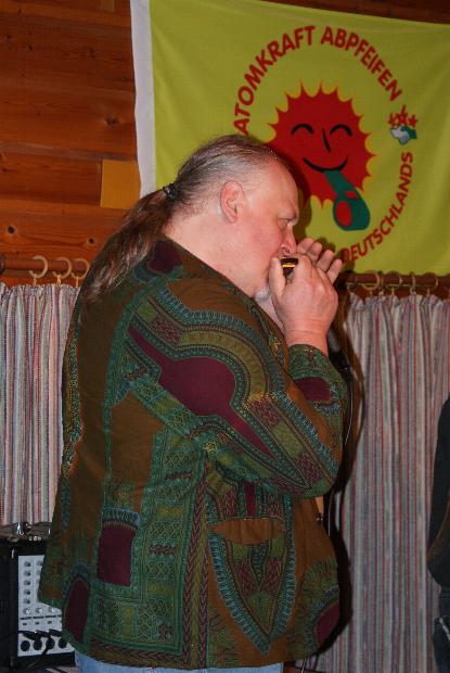 Zu einer musikalisch-literarischen Reise um die Welt mit Klaus Grabenhorst luden die NaturFreunde an diesem Vortag des 1. Mai ein, und fast 90 "Mitreisende" fanden den Weg ins Naturfreundehaus. Denn es war eine besondere Veranstaltung, die da geboten wurde: Klaus Grabenhorst feierte an diesem Nachmittag sein 40. Bühnenjubiläum. Und so war es gleichzeitig auch eine Reise durch Klaus Grabenhorsts Leben und Wirken, und viele Musiker, mit denen Klaus Grabenhorst in seinen verschiedenen Programmen aufgetreten ist, ließen es sich nicht nehmen, auch auf der Bühne vorbeizuschauen und gemeinsam mit ihm zu musizieren. Jens Barabasch begleitete auf seinen Flöten fast den gesamten Nachmittag, zu einzelnen Stücken kamen dann Professor Bottleneck auf der Gitarre, Smeety auf der Mundharmonika und Jochen Nerhausen mit der Saz. Slavka begeisterte das Publikum mit dem lebhaft vorgetragenen russischen Lied vom wilden Eber.