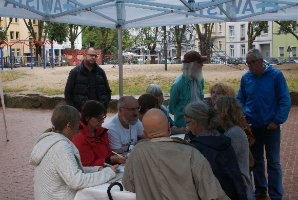 Eingeladen zu den Diskussionsrunden hatten die NaturFreunde NRW, die NaturFreunde Düsseldorf und der Zukunftsmacher Club. Und diejenigen, die trotz des teilweise bescheidenen Wetters auf den Herrmannsplatz gekommen waren, haben dies sicher nicht bereut, konnten sie doch manche Information und Anregung mit nach Hause nehmen, Gleichgesinnte kennenlernen oder sich auch abseits der Diskussionsrunden untereinander austauschen.