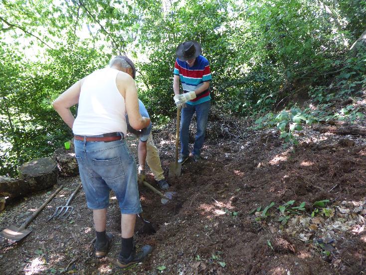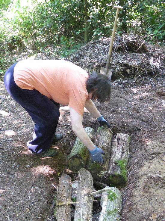 Zunächst ging es an das Ausheben des Käferkellers. Etwa ein Meter lang und 50 Zentimeter breit sollte er werden, vor allem aber auch 50 Zentimeter tief, damit die Käfer und ihre Larven, die sich dort ansiedeln, vor Frost geschützt sind. Was wir nicht so ganz bedacht haben: wenn man im Wald ein Loch buddelt, stößt man zwangsläufig auf jede Menge Wurzeln. Und so mussten wir leider immer wieder ein paar kleinere Wurzeln kappen und um die größeren Wurzeln herumgraben. Aber schließlich war es geschafft und wir konnten das Loch mit Baumstämmen und kleinerem Holz für die Zwischenräume füllen.