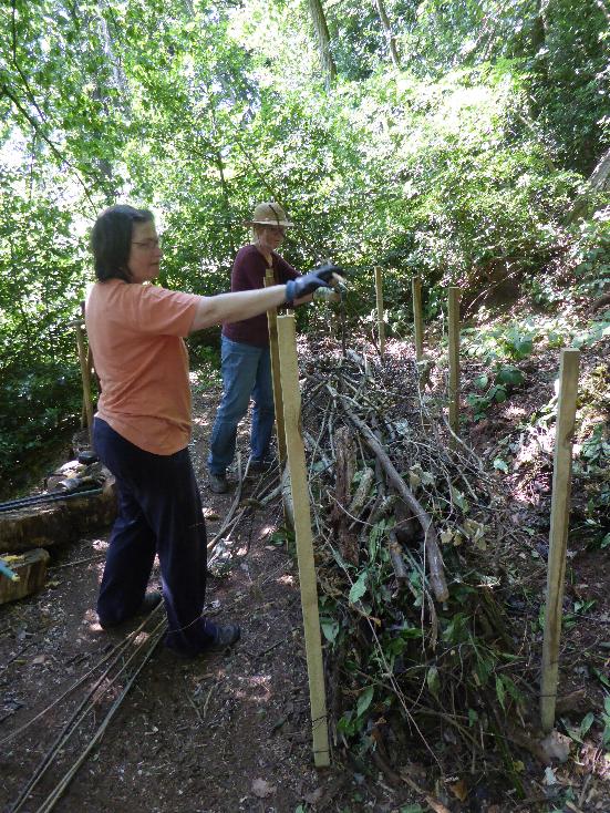 Aber wir wollten es ja nicht bei tollen Bildern und der Theorie belassen, sondern wir wollen auch selbst etwas am Naturfreundehaus tun, um noch mehr Totholzlebensraum dort zu schaffen. Von den Vorschlägen, die Farina uns aufzeigte, einigten wir uns relativ schnell auf eine Totholzhecke, bzw. - wenn neue Pflanzen sich darin ansiedeln - eine Benjeshecke. So wollen wir den Astschnitt, der bei uns auf dem Gelände immer anfällt, an einer Stelle aufstapeln, unterstützt von eingeschlagenen Pfosten, die diese Konstruktion stabil halten. In den Zwischenräumen zwischen den Ästen können dann Säugetiere wie Igel, aber auch viele Vogelarten wie Zaunkönig oder Heckenbraunelle einen Lebensraum finden, aber auch Amphibien oder Insekten fühlen sich darin wohl. Nun müssen wir nur noch einen Termin finden, an dem wir mit dem Bau beginnen - die Hecke wird dann im Laufe der Zeit immer weiter anwachsen, wenn neue Äste dazukommen.