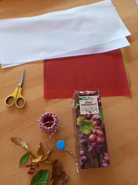 Aus einem Tetrapack und Transparentpapier/Architektenpapier wurde eine Laterne gebastelt. Blätter wurden gesammelt und getrocknet und entweder aufgeklebt oder mit Wachsmalstiften abgemalt. Auch andere Laternen wurden in den letzten Tagen von den Kindern kreativ aus einem Tetrapack oder einer Flasche gestaltet.