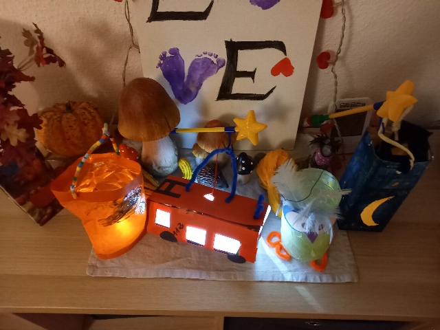 Am 17.10. sind wir gemeinsam mit den Kindern in den Wald um das Naturfreundehaus gegangen. Wir haben eine Waldschatzsuche gemacht und danach mit unseren Schätzen gebastelt, z.B. ist eine schöne Kastanienkette und ein Mobile aus kleinen Ästen für den Garten entstanden.