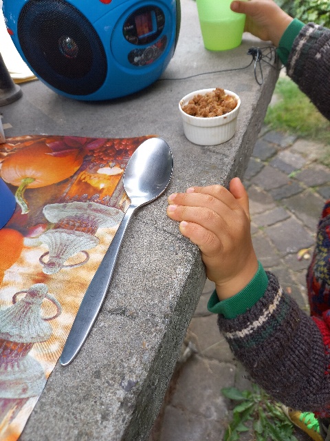 Auch am 12.09. haben wir uns wieder am Naturfreundehaus mit einigen Familien getroffen, einige davon sind neu dazu gestoßen. Unter dem Motto "Der Apfel und unser Apfelkuchen" haben wir die bereits vor etwa zwei Wochen gepflückten Äpfel zu einem Apfelcrumble verarbeitet. Jedes Kind durfte ein kleines Schälchen mit der Apfelmasse und den Streuseln zubereiten. Danach kam alles in den Ofen.