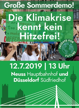 Daher unterstützen die NaturFreunde Düsseldorf gemeinsam mit vielen anderen Umweltverbänden, Gewerkschaften,... die Bewegung "Fridays for Future" und rufen gemeinsam auf zu einer großen Sommerdemo unter dem Motto "Die Klimakrise kennt kein Hitzefrei!" am Freitag, 12. Juli um 13.00 Uhr ab dem Südfriedhof Düsseldorf.
