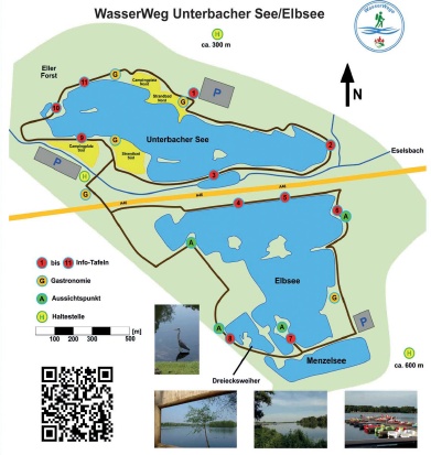 Wanderzeit: etwa 3,5 Stunden (12,6 km), Rundweg Unterbacher See 5,9 km, Rundweg Elbsee 6,2 km